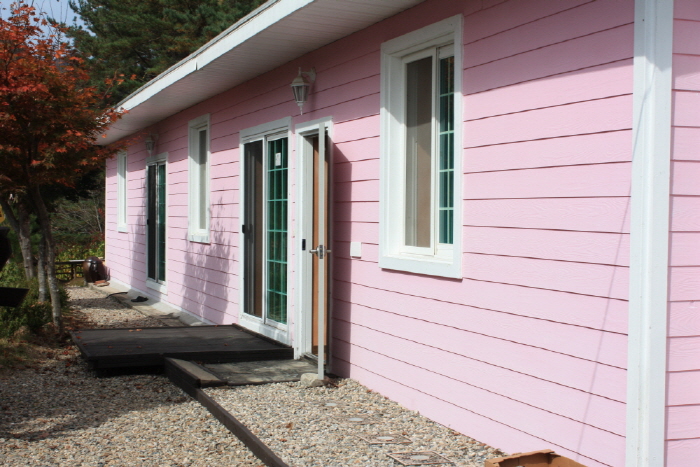 핑크하우스는 소나무와 편백나무가 어우러진 경치, 폭포와 핑크색이 어우러지고 금당계곡이 한눈에 보이는 경치가 아름다운 곳이다.