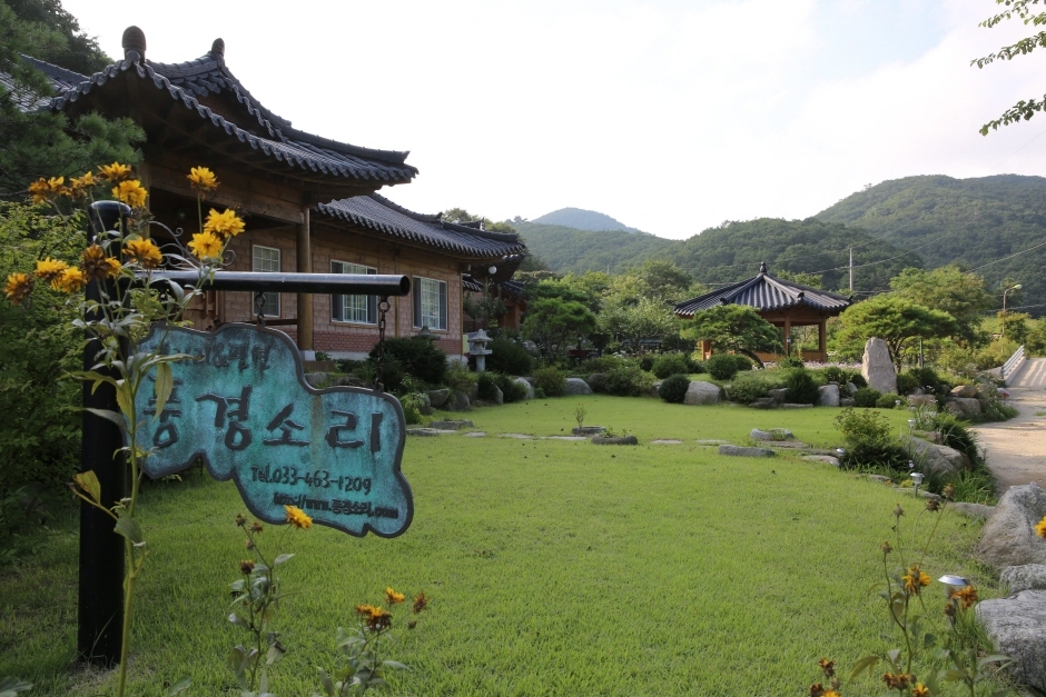 태백산맥 설악산 자락 점봉산 아래 평화롭고 너그러운 한옥 한 채가 우리를 기다리고 있다. 곰매령 산행 하기전 초입에 위치한 한옥펜션으로 곰배령과 단목령이 갈라지는 지점에서 단목령으로 조금만 들어서면 따뜻한 커피 한 잔을 음미할 수 있는 공간이 자리하고 있다. 사계절 시간과 계절에 따라 변화하는 모습만 바라보고 있어도 세상을 다 얻은 것처럼 여유롭고 행복함을 느끼는 곳이 이곳 풍경소리 펜션이다. 총 7동을 운영 중이며 거실, 방, 화장실 2룸으로 깔끔함을 느낄 수 있다. 펜션 옆의 카페에서는 전통한옥의 편안하고 우아함을 만끽할 수 있고, 동시에 갤러리에서는 다양한 전문 사진가의 작품을 감상할 수 있으며 그윽한 커피 향과 전통차 맛을 느낄 수 있다. 전문서적(사진관련)과 주인장의 세계 여행을 하면서 보고 느낀 여행담, 그리고 실제 사진가의 사진 이야기가 넘쳐나며 별과 달을 벗 삼아 이야기를 나눌 수 있는 추억과 향수의 공간이다.