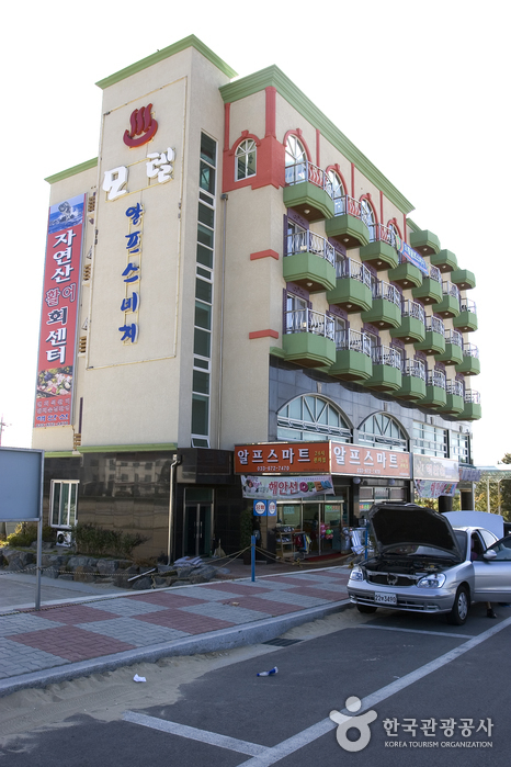 하조대해수욕장 바로 앞에 위치한 알프스 비치는 호텔급 수준의 깔끔하고 세련된 객실과 격조 있는 실내 인테리어를 자랑하고 있다. 월풀 욕조, 벽걸이형 PDP, 초고속 인터넷 등 최신식의 부대시설과 세련되고 고급스러운 가구들로 머무는 시간 내내 편안하고 안락한 느낌을 준다. 창문을 열면 바로 해수욕장의 백사장이 내려다보일 정도로 인접해있어 객실에서 바로 수영복 차림으로 바다로 향할 수 있으며, 항구와도 가까워 해수욕을 마친 뒤에 값싸게 해산물을 맛볼 수 있을 만큼 휴양지로는 최적의 숙소라 할 수 있다. 아침에 침대에 누워 일출을 감상할 수도 있어 더욱더 낭만적이다.